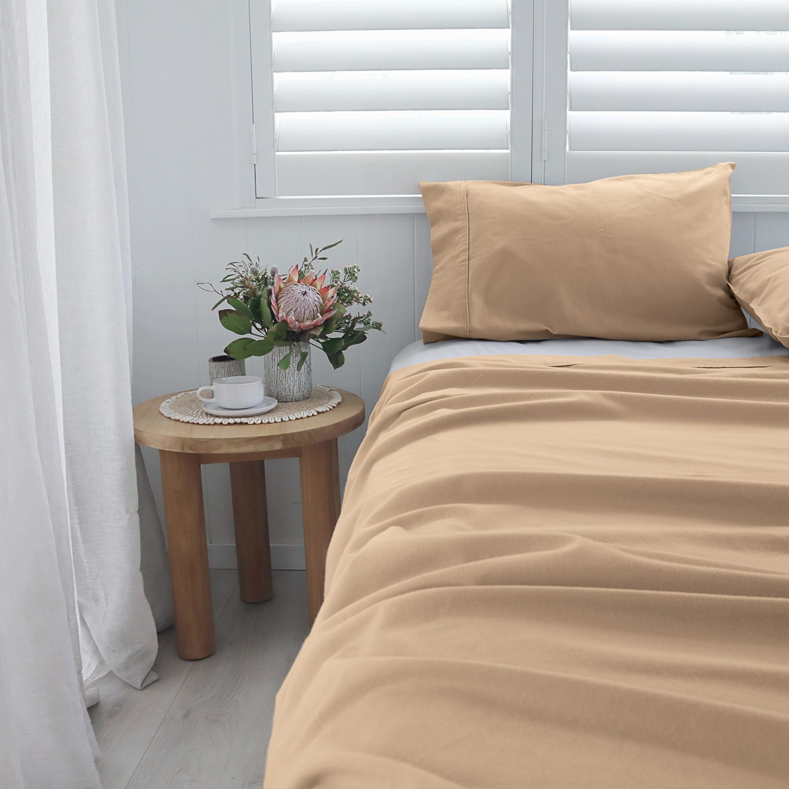 Indulge in the ultimate coziness with our Latte Flannelette Sheet Set. Crafted from premium 100% cotton flannelette, these sheets offer unmatched softness and warmth. The brushed surface not only feels incredibly plush but also provides exceptional insulation, making them ideal for chilly nights. This set includes a fitted sheet, a flat sheet, and two pillowcases, all expertly designed for a secure and wrinkle-free fit in your bed. The timeless Latte colour effortlessly and complements any bedroom decor. Experience the luxury of our Latte Flannelette Sheet Set., whether you’re reading a book, enjoying a lazy morning or drifting into a peaceful night’s sleep. Upgrade your bedding today.